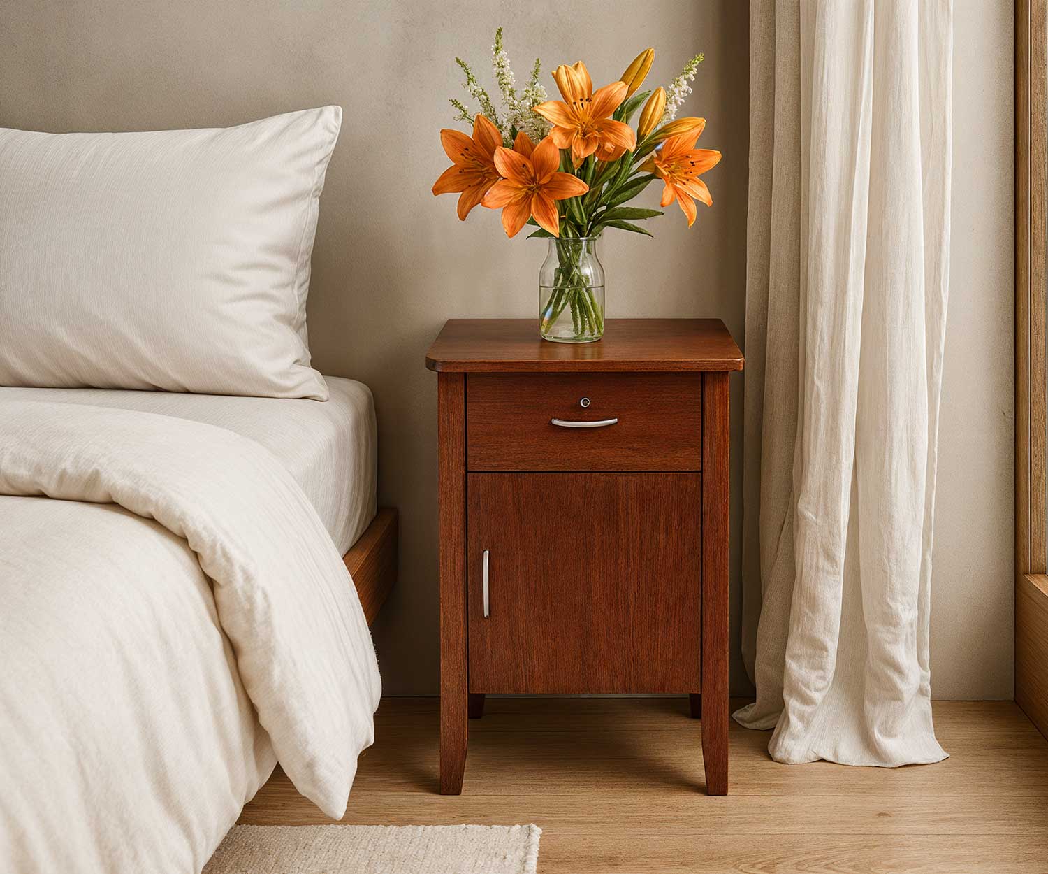 Thoughtfully built for everyday use, the Freya features a lockable top drawer—ideal for safely storing personal items, valuables, or medication—along with a generous cupboard compartment for books, magazines, and other larger essentials. Its spacious top provides room for a lamp, clock, or smart devices, keeping everything within easy reach.