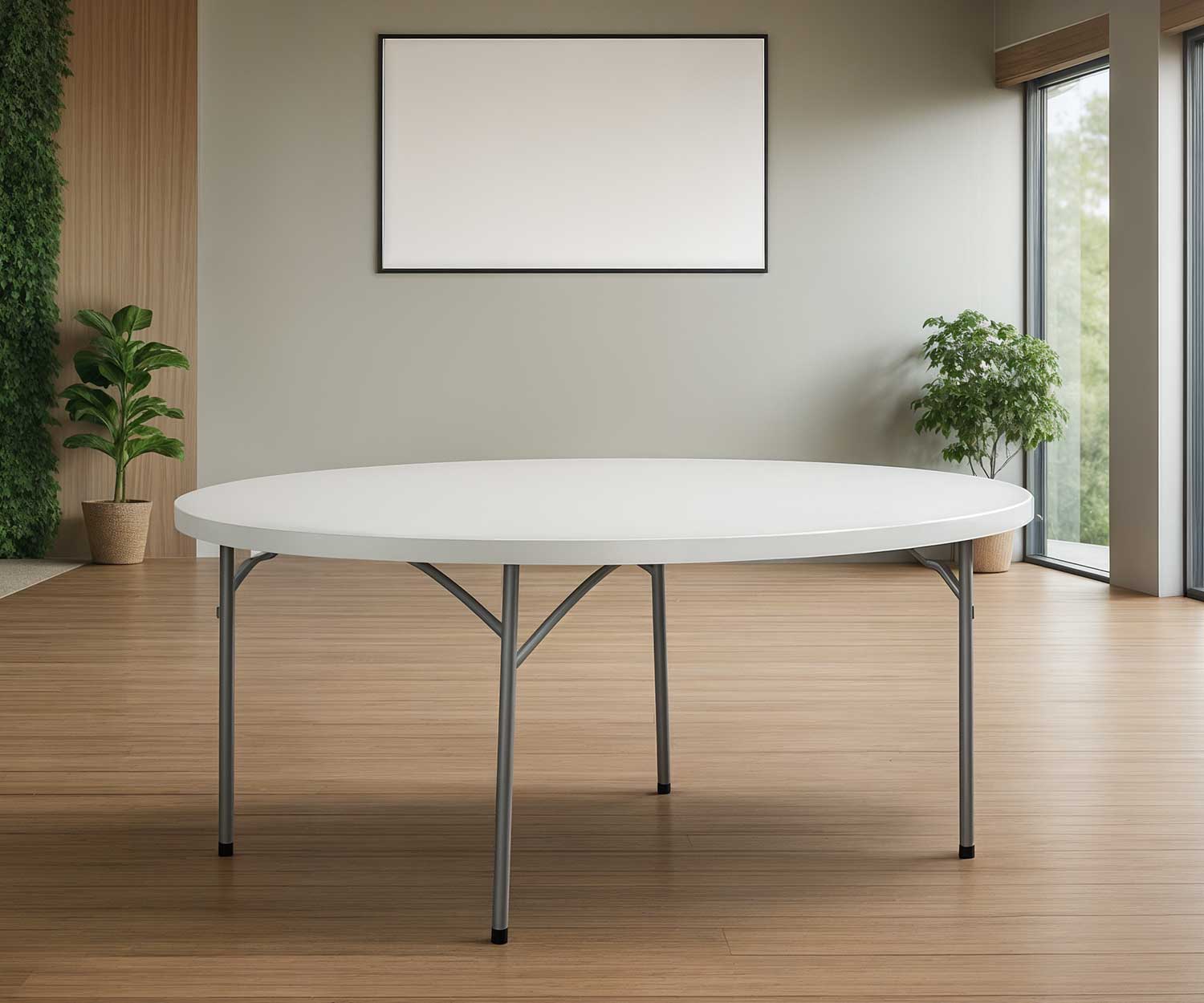 The Manhattan Banquet Table 152 Round is a commercial-grade table with a high-density polyethylene blow moulded white top and powder-coated steel frame.